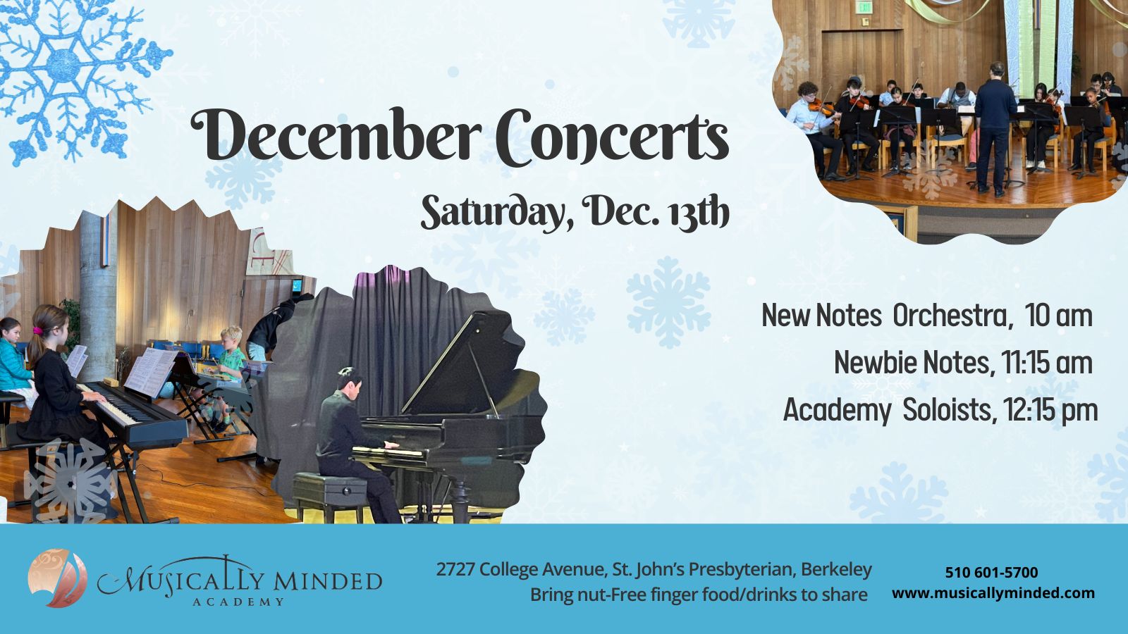 Come enjoy our soloist students showcasing their winter music! Students of all ages will perform solo works. Invite family and friends, the more the merrier! Also, bring nut-free finger food or single-serve drinks to share with the group.